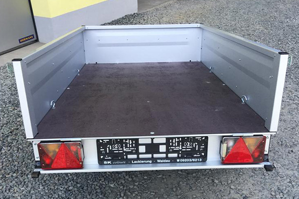 V-Zugdeichsel (verzinkt); Stützrad; zusätzliche Längsverstrebung; Seitenwände aus Stahl (verzinkt); Hintere Bordwand abklapp- und abnehmbar; Kunststoffkotflügel; Abrissseil; 4 Zurrösen; 13-poliger Stecker; Tempo 100 km/h Zulassung; 3 Jahre TÜV bei Neuzulassung.